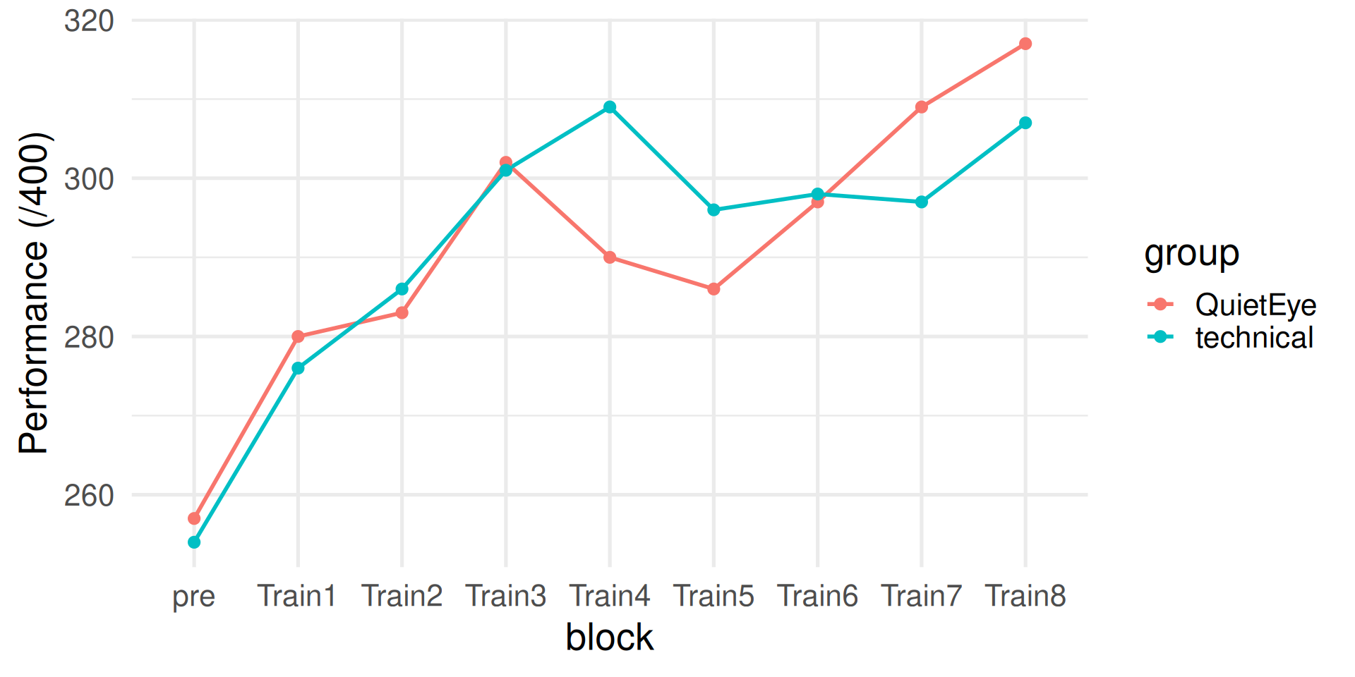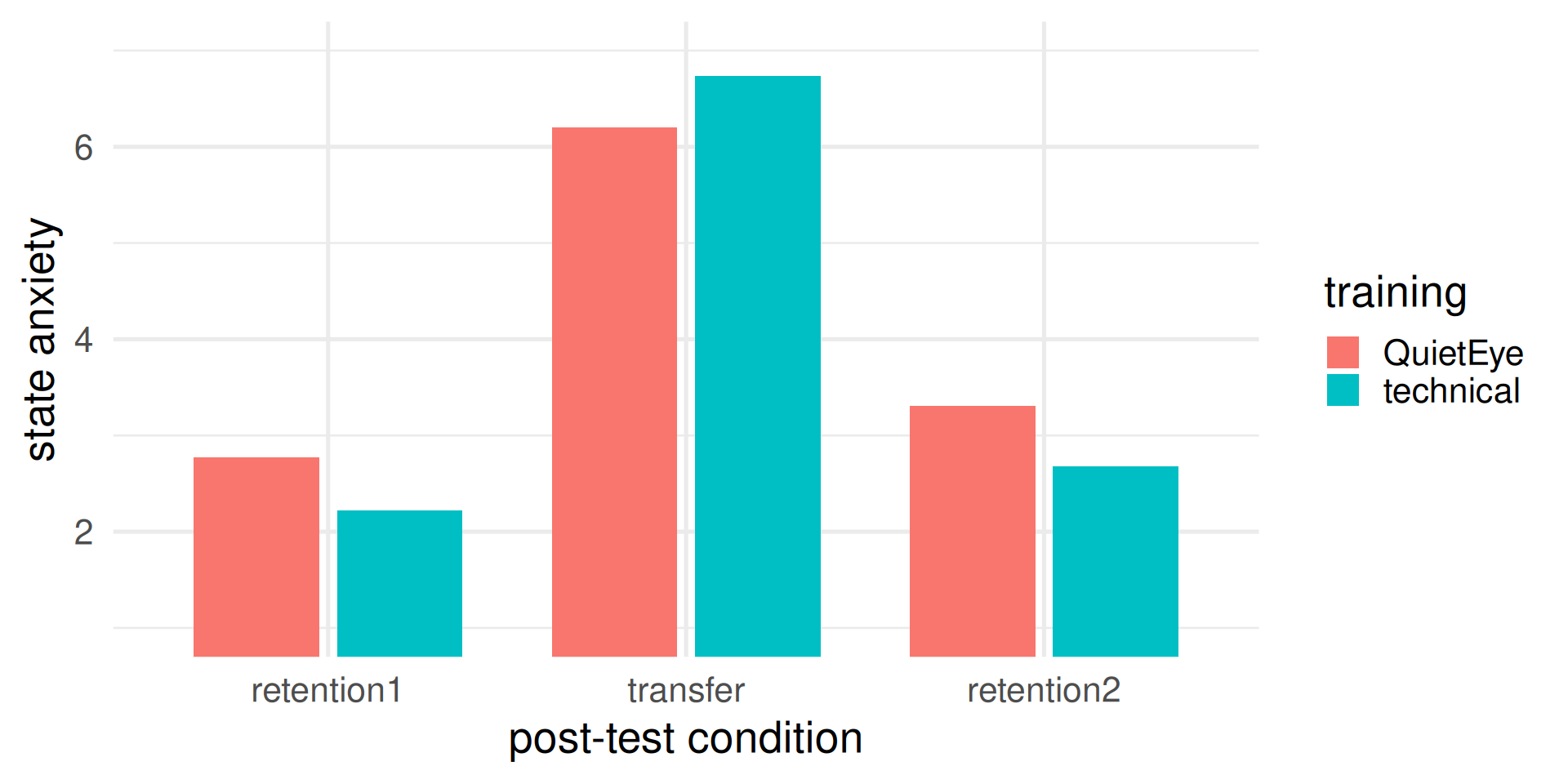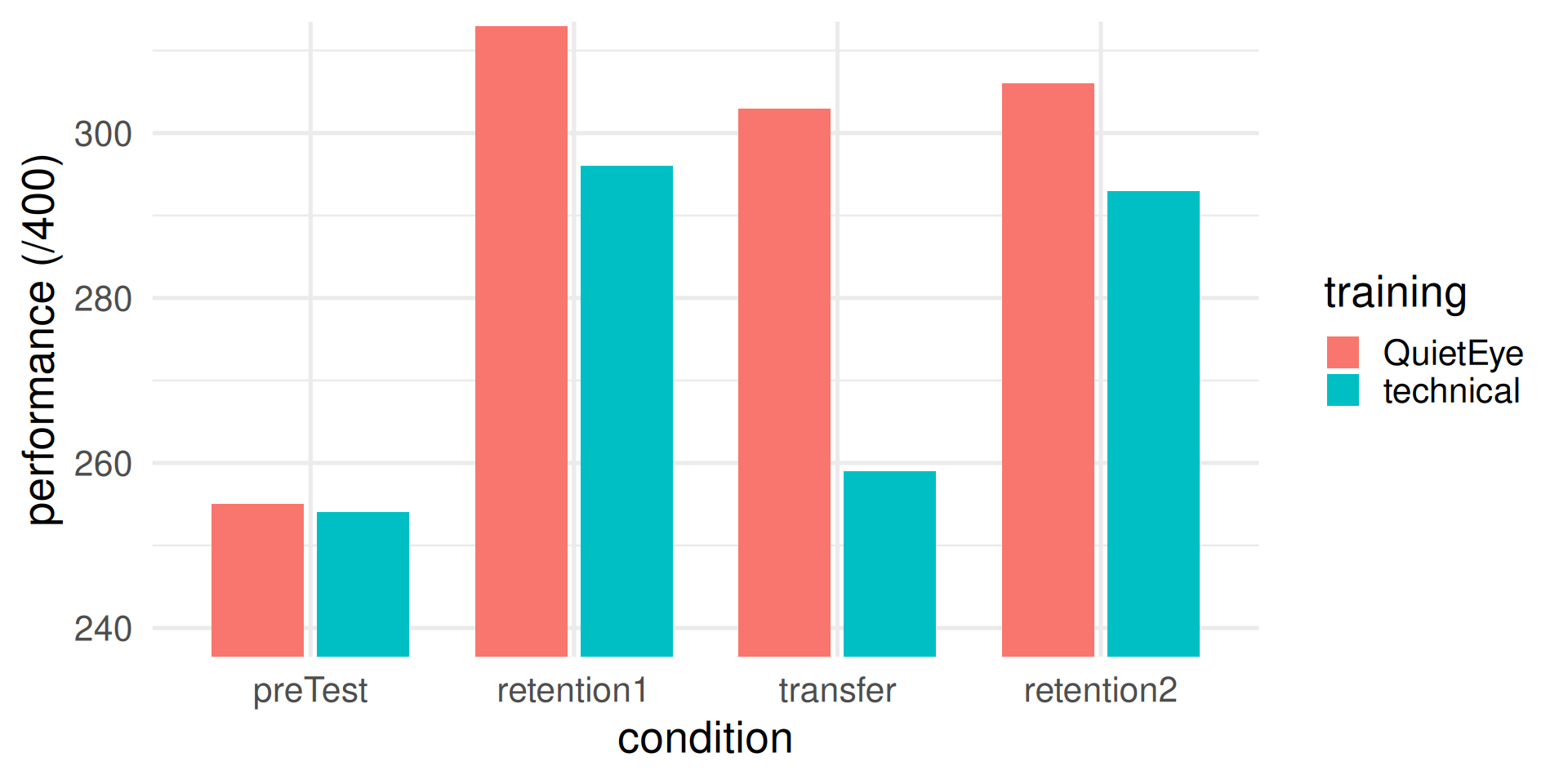 Performance was comparable across groups at all retention post-tests, except at transfer (high pressure performance), where the technical but not the Quiet Eye group showed a significant drop in performance