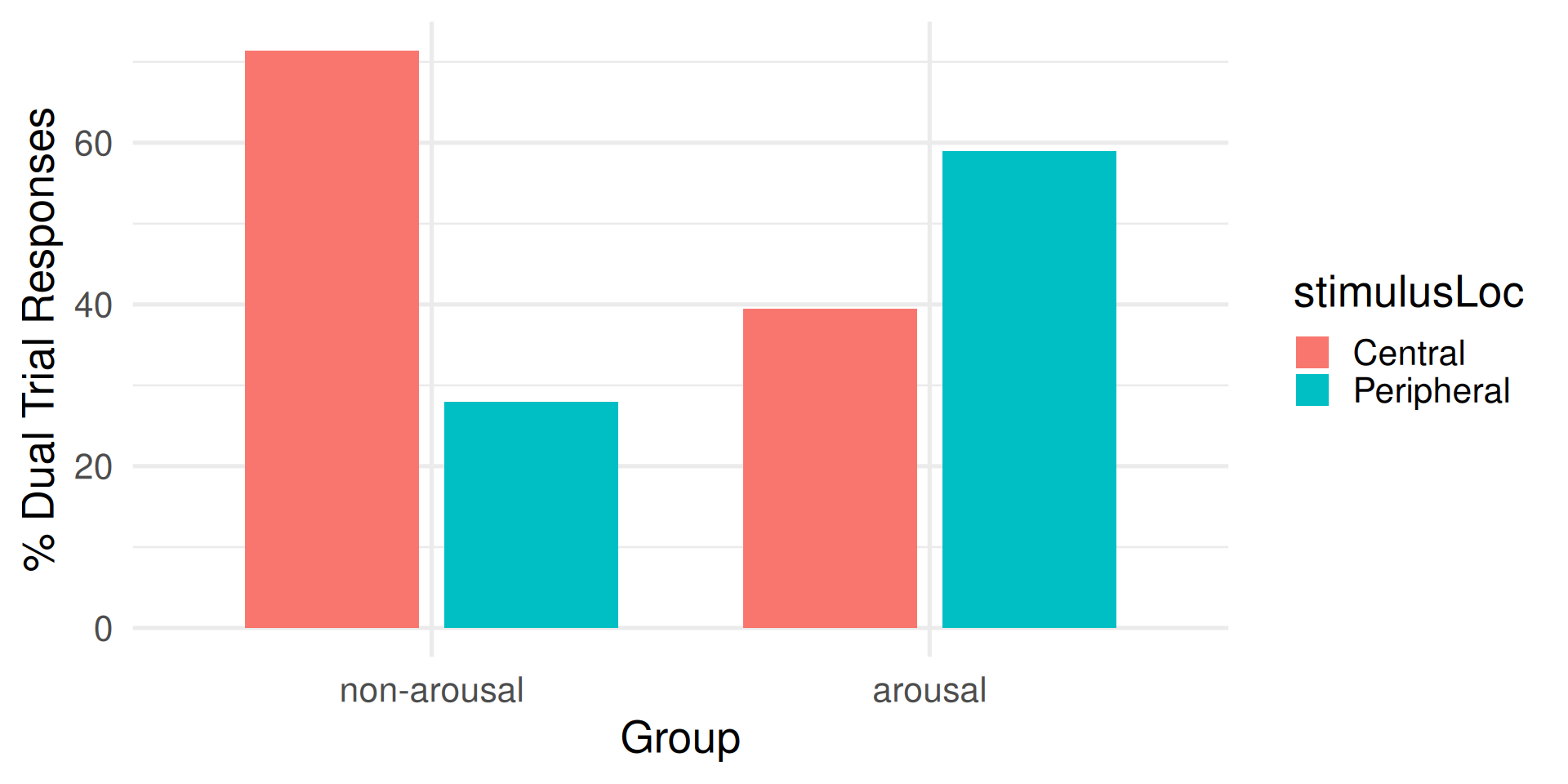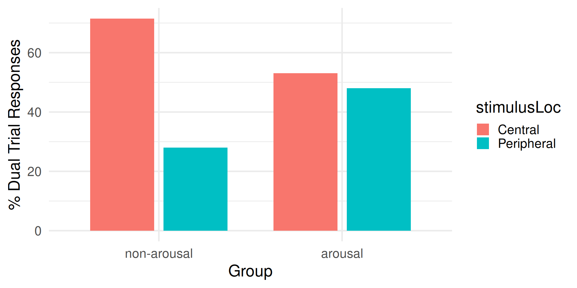 For the non-arousal group, dominance of central stimulus