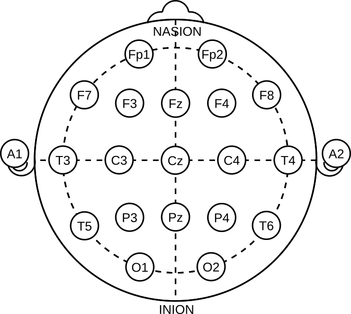 Electrode positions are labeled with letters and numbers, where letters correspond to brain regions (e.g., F for frontal, T for temporal) and numbers indicate the hemisphere (odd numbers for the left, even numbers for the right).