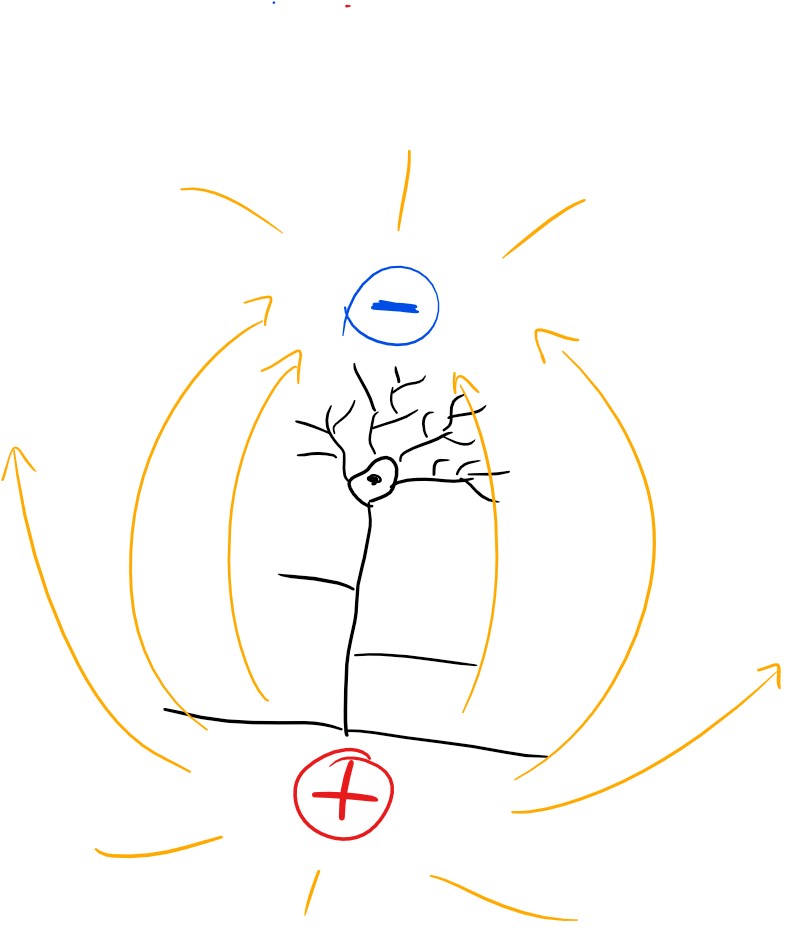 Electric fields propagate through the tissues (volume conduction), allowing us to detect the activity of neuronal populations from electrodes placed on the scalp.