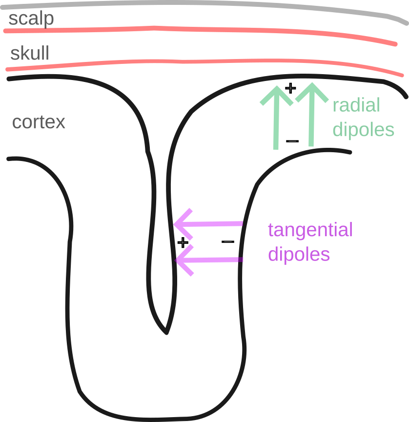 We can observe scalp activity but it is challenging to determine the exact location of the underlying dipoles (so called, inverse problem).