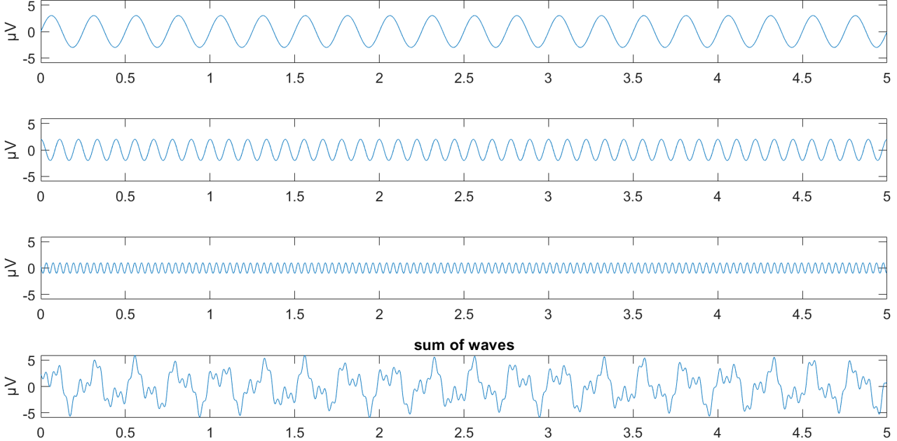 EEG signals appear like complex waveforms, consisting of multiple overlapping waveforms that vary in frequency, phase, and amplitude.
