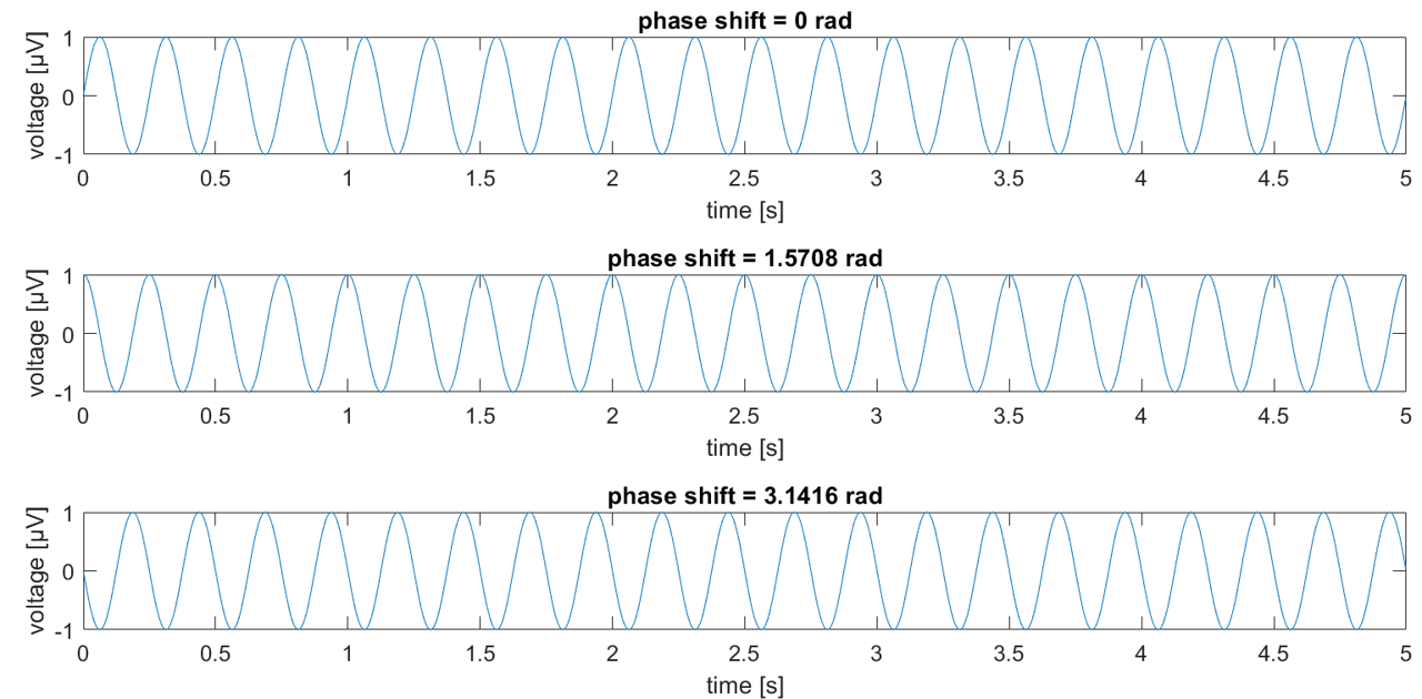 Let’s sum, time by time, three waves varying in frequency, phase, and amplitude.