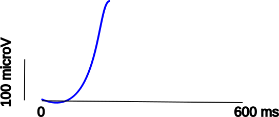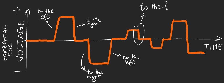 For example, voltage increases as you move the eyes up. You would expect the voltage to not change is you maintain your eyes in that position. But when high-pass filtering is applied, the voltage goes gradually back to baseline even if the eyes are still up.