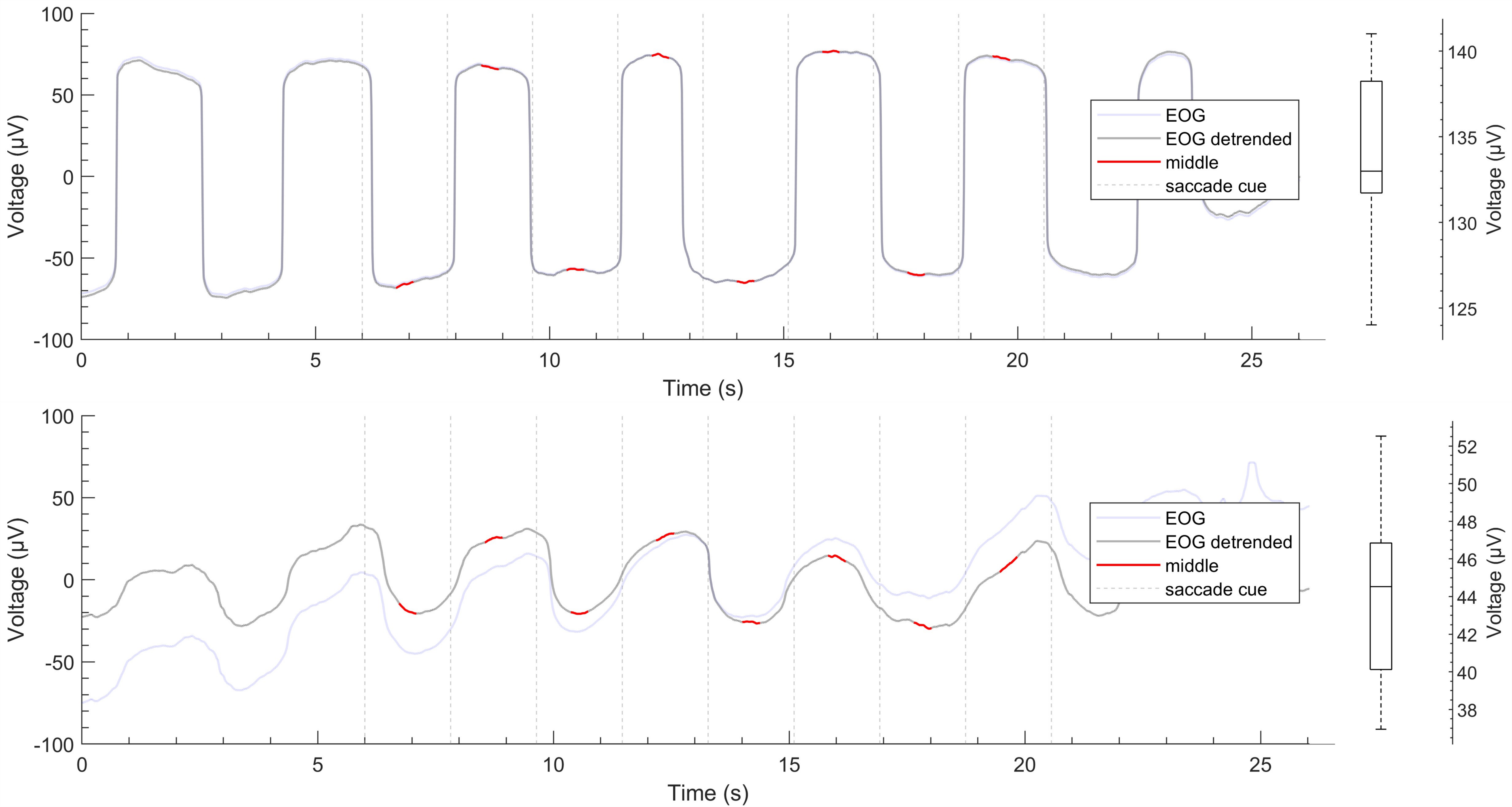 Head movement confounders: EOG saccadic signals reflect movements of the eyeballs relative to the head. By looking at the EOG only or without behavioural constrains, it is difficult to know whether the eyes, the head, or both have moved.